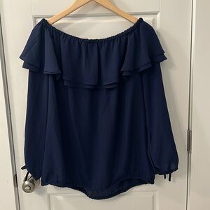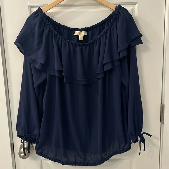 Navy blue Michael Kors blouse. Purchased at Dillards. Elastic boat neck and bottom hem. 3/4 sleeves with elastic/tie hems. Collar with double ruffle detail.
