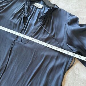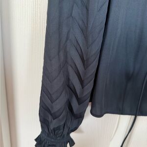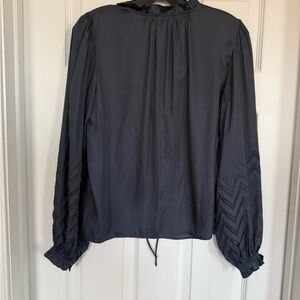 Chic navy blouse by featuring elegant ruffled details. Ideal for versatile styling. Size small— fits like a medium.