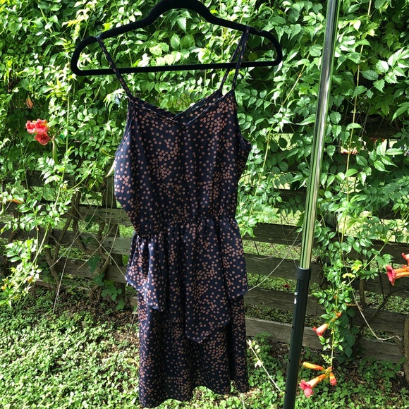 Thing straps, loops for belt. Silky , with orange/bronze dots throughout.