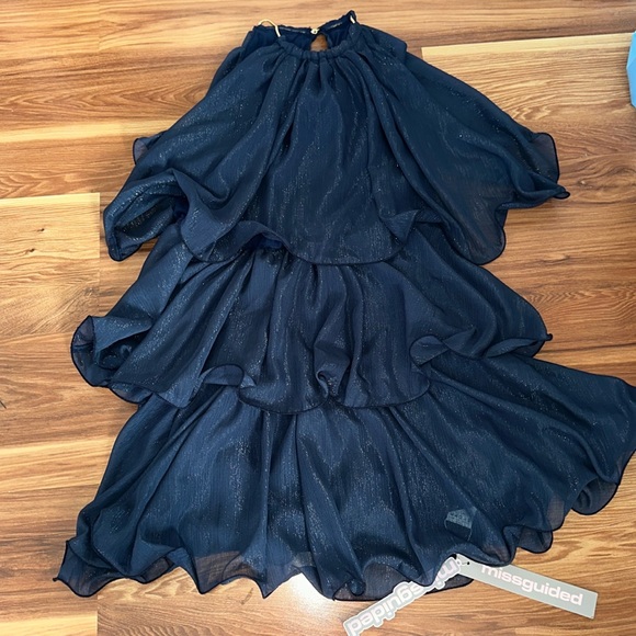 Navy Ruffle Dress. Halter neckline. Never worn. Size: L (8/10)