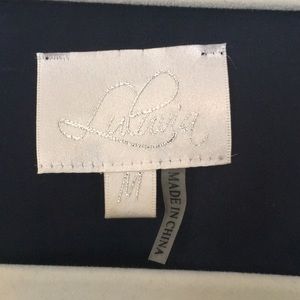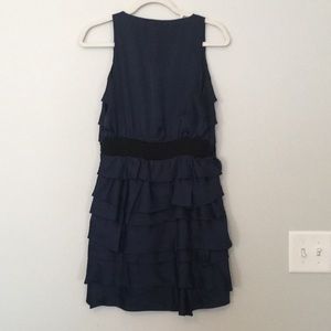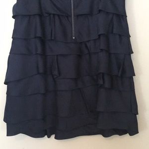Deep navy blue dress with black accent at waist. Ruffle details and front zip feature make this dress unique! Minor spot (shown in picture), but barely noticeable due to the dark color. Overall good used condition.