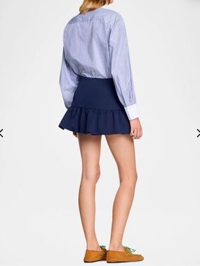 Chic navy mini skorts with a flared ruffle hem. Smooth high waistband for a sleek fit. Versatile and feminine style. Easy to pair with shirts or blouses.
