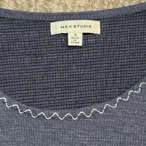 Chic navy tee with ruffle sleeves. Features zigzag stitching detail. Perfect for casual wear.