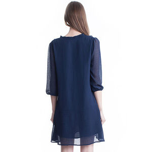 NEW ARRIVAL- Flowy ruffle tunic shift dress in Navy. Pullover style. 3/4 length sleeves. Dress up with heels or down with sandal flats. Fully lined. Fabric content: 100% Bubble-textured Polyester and woven Polyester lining. Hand wash cold. Modest length for someone 5'2 and shorter or pair with leggings. Imported.