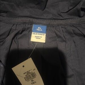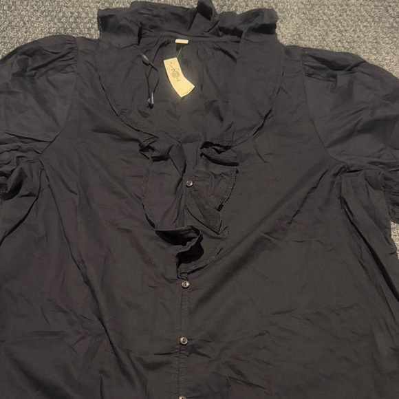 Chic navy blouse with button-up design. Perfect for any occasion. Ruffle collar