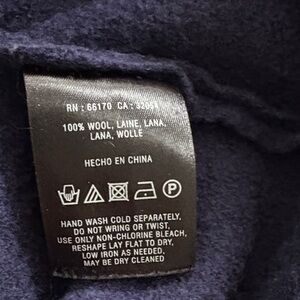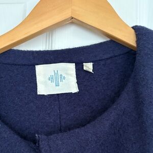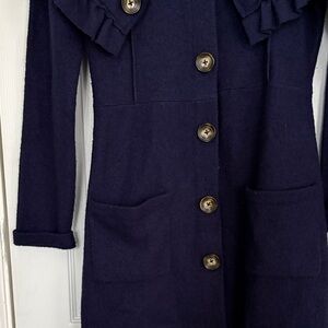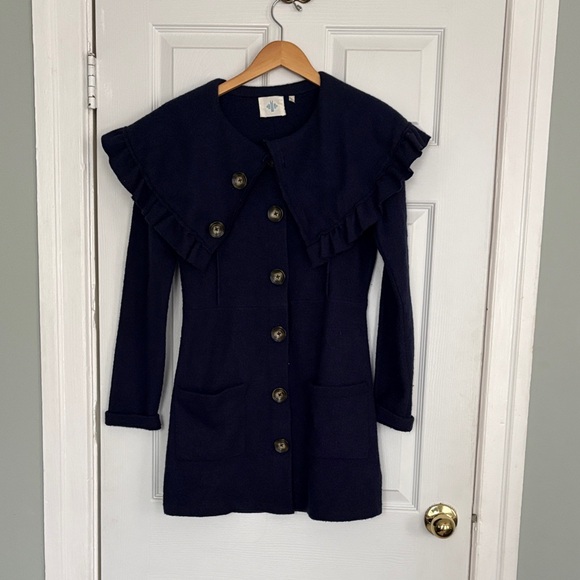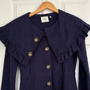 Stylish navy coat with ruffled collar and button-up front. Features two front pockets. Felted wool.