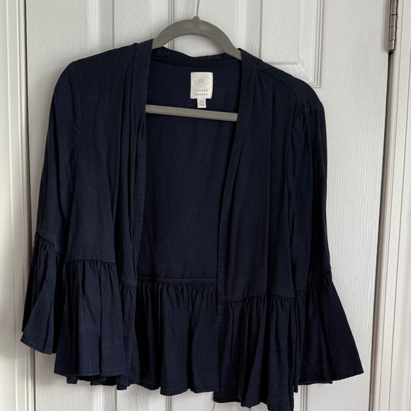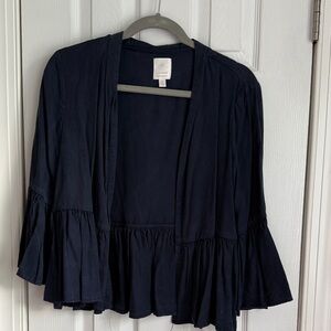 Stylish navy open cardigan with 1/3 quarter ruffled sleeves. Perfect for layering.