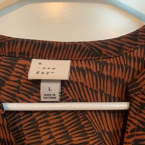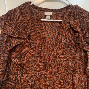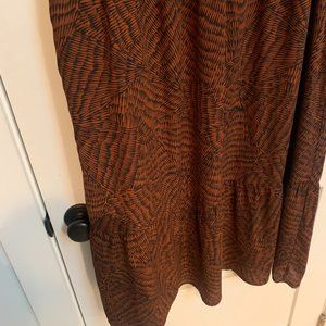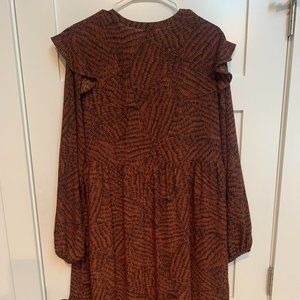 Dress was purchased from Target and only worn once. It is a beautiful rusty brown and navy colored dress with a ruffle detail at the top / shoulder area.