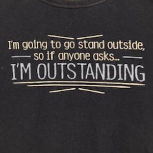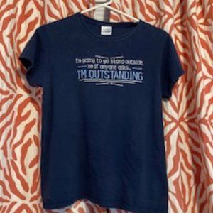 Whimiscal t-shirt in Navy blue, with logo "I'm going to stand Outside, so if anyone asks, I'm Outstanding"!