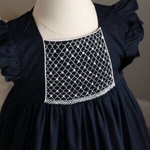 This sweet little Navy smocked dress is PRECIOUS! It is the perfect piece to add to your little girl's wardrobe for transitioning between seasons. The bodice is fully smocked and adorned with White embroidery accents. A sweet ruffle extends on each side from the back of the waist to the front of the waist. This creates darling little flutter sleeves (similar to a pinafore style). A matching sash ties into a bow for the perfect fit. The back has an upper button closure done in matching buttons. Pair with a White cardigan, White tights and either Navy or Black Mary Janes for transitioning to Fall. Add a big White hair bow for the finishing touch or Pair with a Red cardigan, White tights and Red Mary Janes and a Red hair bow for a pop of color! Classic and Timeless!! Great Find-No longer in Production!! New With Tags.