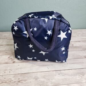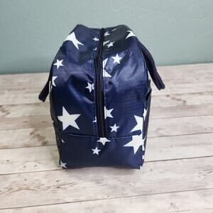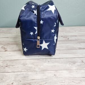 Features: plastic coated canvas exterior, insulated interior. One outside pocket, inside compartment zips closed.