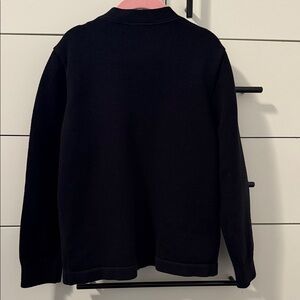 Stylish black cardigan featuring a crest logo on the chest. Perfect for a classic look.