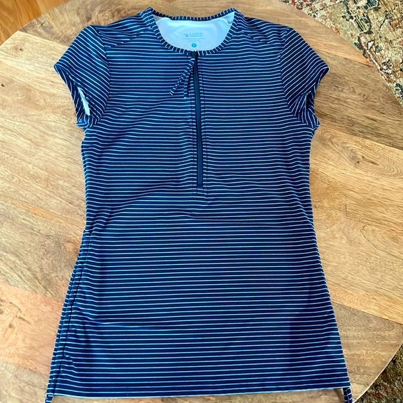 Navy blue with a small white pinstripe. Excellent condition. Minuscule discoloration spots on the back that is likely due to sunscreen.