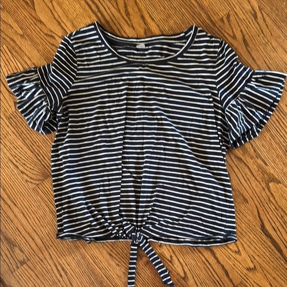 Elevate your style with this chic navy striped top. Featuring playful ruffle sleeves and a tie front, it's perfect for any occasion.