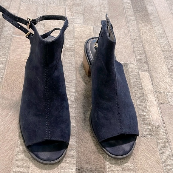 So Cute! Navy suede peep toe sandals. Sandals have open heel with 2 straps around upper ankles. Great condition