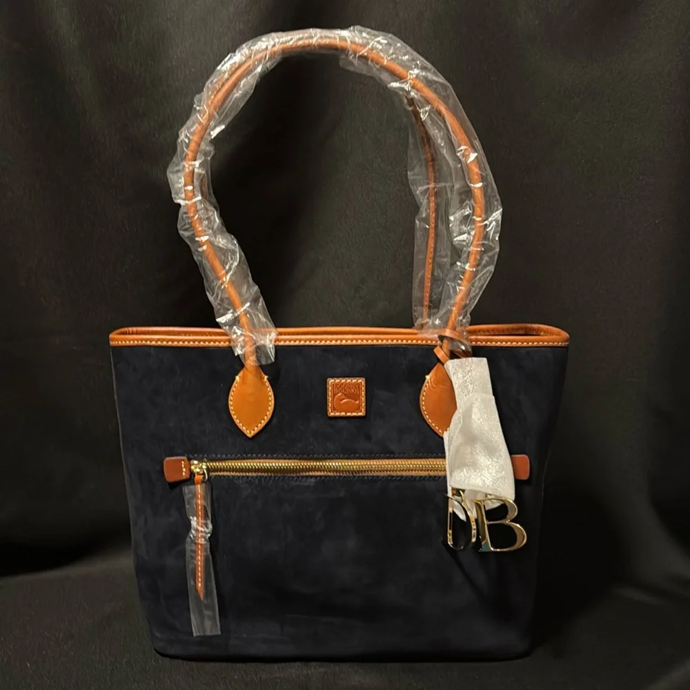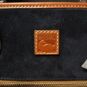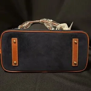 Dooney & Bourke Navy Suede. Zipper closure. Strap drop length: 10". H 9.5" x W 5.5" X L 11.75". 2 lbs. One outside zip pocket. One inside zip pocket. Two inside pockets. Cell phone pocket. Inside key hook. Lined. Feet.