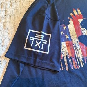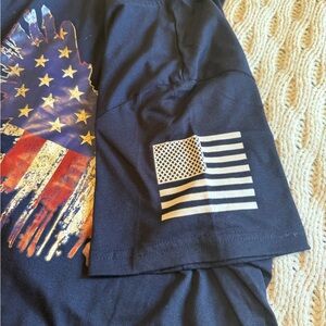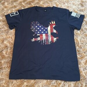 Navy t-shirt featuring an American flag eagle graphic. Patriotic style with short sleeves.