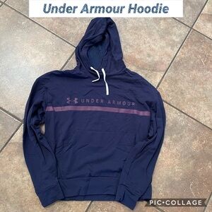 Navy Under Armour Hoodie. Hoodie is light weight & has “Under Armour” on front in light purple. Back is plain. Excellent condition