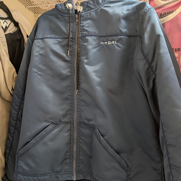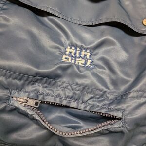 two pockets in the front with a zipper front and drawstring. Nice and warm. inside. is a size large. has a cute pocket and zipper pocket on the back. see pictures. overall in great condition. does have some minor wear and tear and a few tiny poles but nothing major. remember this is over 25 years old from Y2K.