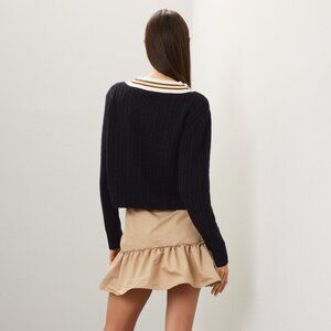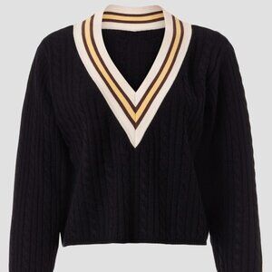Varsity vibes but with a punk edge. This striped v-neck cable knit sweater by Sandro is weekend-ready with a raw tattered hem and cropped silhouette. Style over a long oxford for an instantly fun outfit.