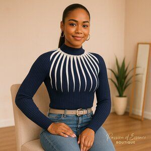 Navy & White Colorblock Mock Neck | Statement Knit Top | Elegant Boutique Style