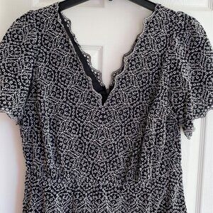 Navy & White Embroidered Short-Sleeve Romper With Scalloped V-Neckline & Elastic