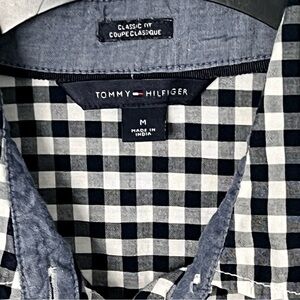 Navy and White Checkered Gingham Shirt • Women’s Size Medium • Tommy Hilfiger Button Up • Classic Fit Top • Button Tab Sleeves • Light Denim at Neckline and Cuffs
