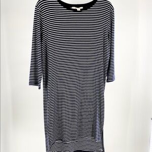 This navy and white 3/4 sleeve high low knit T-shirt dress is perfect for any occasion. It was worn once for a photo shoot.