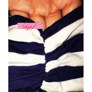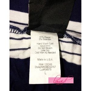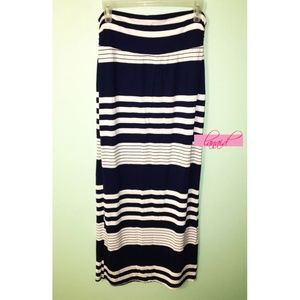 NO OFFERS. PRICE IS FIRM AND NON-NEGOTIABLE. NO TRADES OR HOLDS. Beautiful navy blue/white striped maxi skirt, size L. Purchased at Macy’s. Wide waistband is ruched at the sides. Super buttery soft and flattering on! Dress up or down. Approximate length, lying flat and unstretched: 41”.