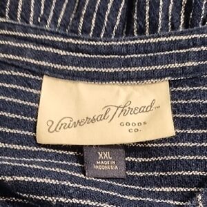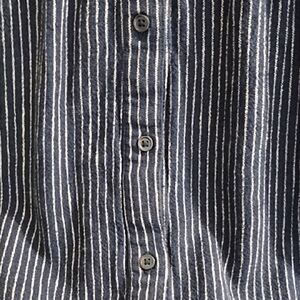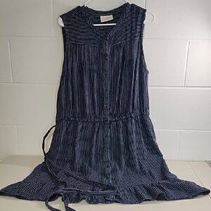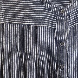 Navy & White Stripe Linen Blend Button Down Shirt Dress Ruffle Hem Knee Length
