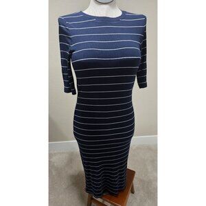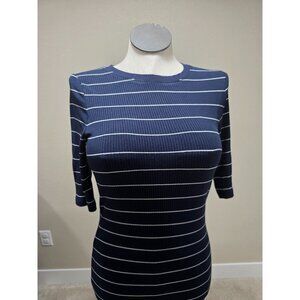 Navy & White Striped Fitted Ribbed Knit Dress With 3/4 Sleeves & Round Neckline