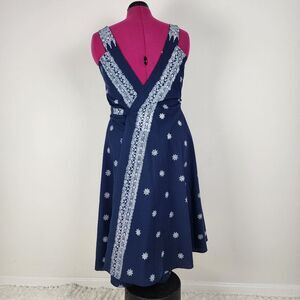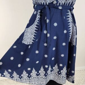 Navy White Wrap Midi Dress Boho Print Fit And Flare A-line Pockets Summer Casual