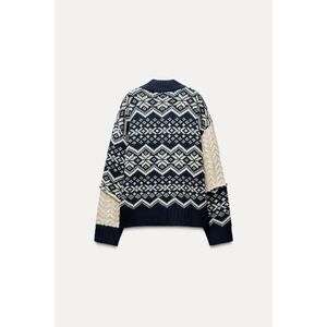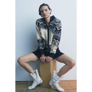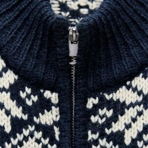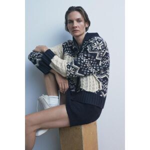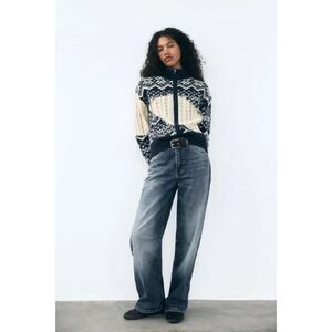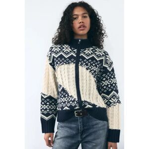 Navy White Zara Fair Isle Cable Knit Zip Front Collared Cardigan Sweater, NWT