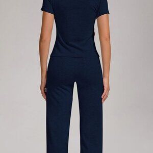Navy Women's 2 Piece Lounge Set Slim Short Sleeve Top Elastic Waist Straight Leg