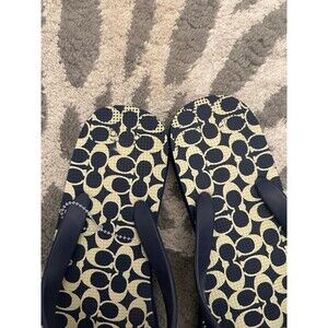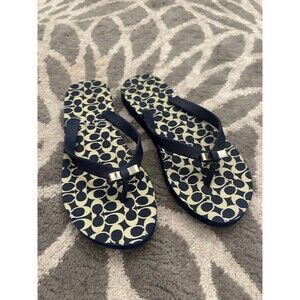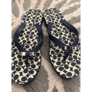 Navy and Cream Monogram C Coach Flip Flops with Silver Bow