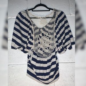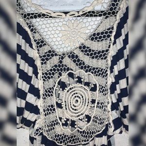 Beautiful Striped Navy Blue and Cream Colored Shirt. Baggy on Top and Tighter Around the Waist! Button Down Front and Knitted Lace Looking Backing!