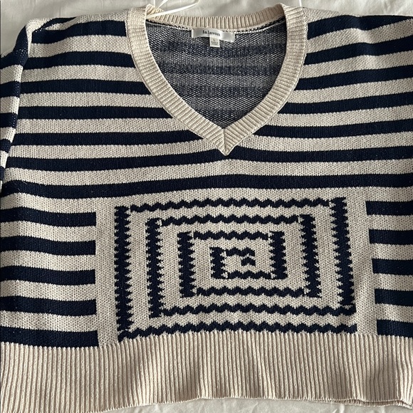 Elevate your wardrobe with this elegant navy and cream striped V-neck sweater. Perfect for casual outings, it offers both style and comfort.