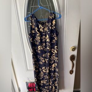 Elegant navy maxi dress with gold floral pattern. Sleeveless design. Has split up side. LRB
