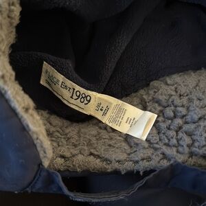 Cozy winter hat in navy and gray. Features a warm, plush lining. Preloved. Kids size L/XL.