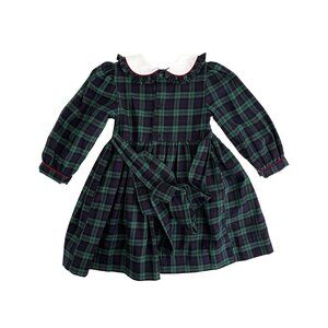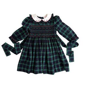 Navy and green plaid hand smocked vintage Sophie Dess dress, the dress is New without Tags, it has never been worn. The dress is made of 55% cotton and 45% polyester, is hand smocked, has buttons on sleeves and back to waist, sash, white twill collar with hand embroidery and fabric ruffle. Perfect holiday, Christmas or everyday dress.