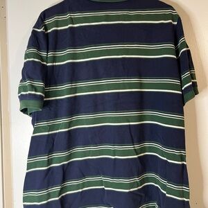 Stylish navy and green striped polo shirt. Perfect for casual outings.