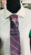 Stylish navy tie with red and white stripes. Features a unique key pin accent.