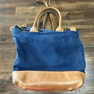 Elegant navy canvas tote featuring tan leather accents. Includes dual handles and a detachable shoulder strap. Some wearing on the bag. Comes from a smoke free, pet friendly home.