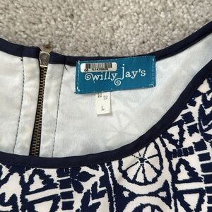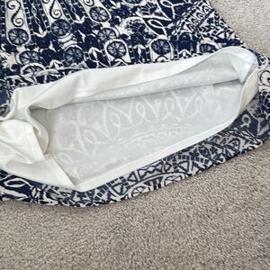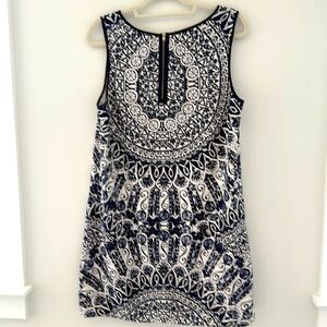 Stylish coastal sleeveless dress with intricate navy and white lined dress with Navy and white patterns. Perfect for casual or dressy outings. Great condition and comes from a smoke/pet free home.