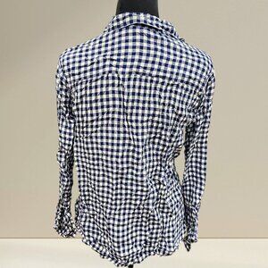 Classic and effortlessly stylish, this navy and white gingham shirt is a timeless favorite. Made from lightweight, breathable fabric, it features a button-front closure, collared neckline, and long sleeves for a versatile look that transitions seamlessly from casual to polished. Perfect for pairing with jeans, shorts, or layering under a sweater for a preppy, put-together vibe.