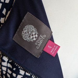 Navy and white patterned long sleeved shift dress by Vince Camuto.