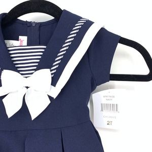 Charming navy and white striped girls sailor dress with a cute bow detail. Perfect for any occasion.