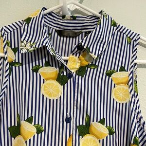 Navy and White Striped Sleeveless Shirt Dress with novelty lemon print. Size S