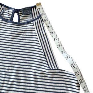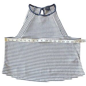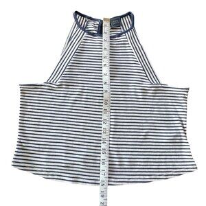 Preowned, GUC. No rips, holes, or stains. This is a cute summer top, with a keyhole back. It's navy and white striped, and would probably be a good layering piece, as it offers no support. Soft poly /cotton / rayon blend. It's beach ready, and has a classic feel about it. =)