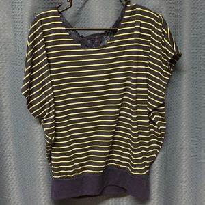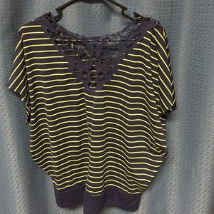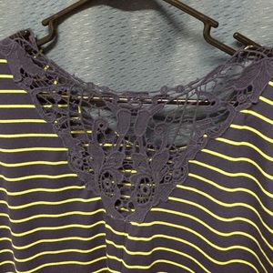 This shirt flows until the tighter solid blue band at the bottom. It is very comfortable and has a partial lace back.